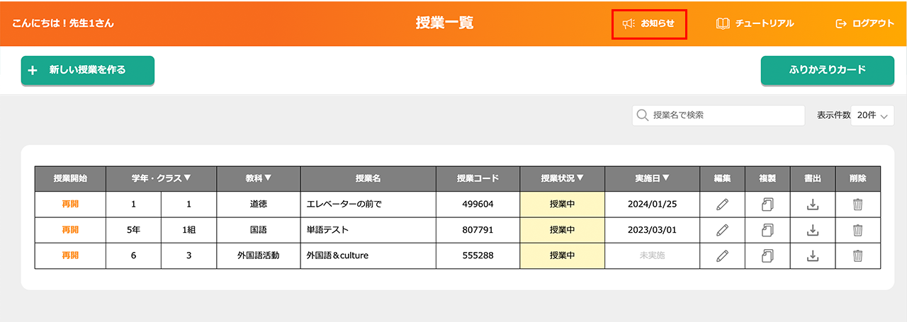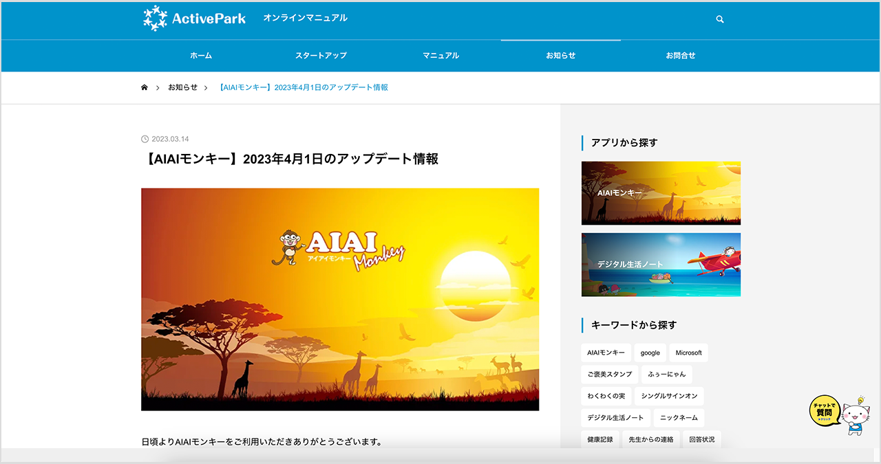 AIAIモンキー 基本機能 先生へのお知らせ 2022.08.01 2025.11.27 アプリに関するアップデートやメンテナンスなどが発生する場合は、順次ホーム画面にてお知らせしております。「お知らせ」は、ホーム画面上部のバナーで確認することができます。 ①詳しい内容を確認するときは、バナー上をタップバナーは一度クリックすると消えてしまうので、ご注意ください。 ②お知らせページが表示される ③再度お知らせを確認したい場合は、ホーム画面の「お知らせ」をタップ