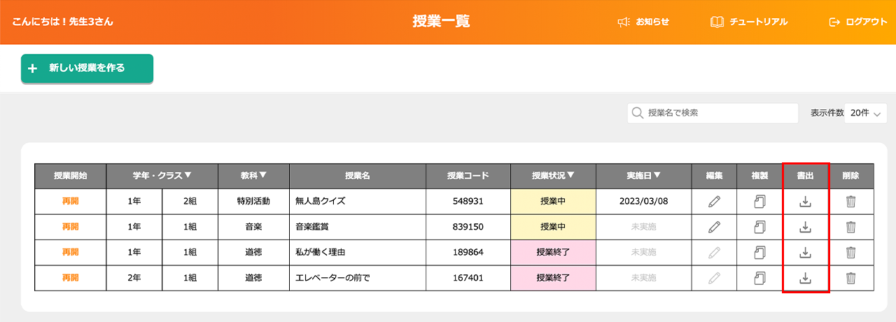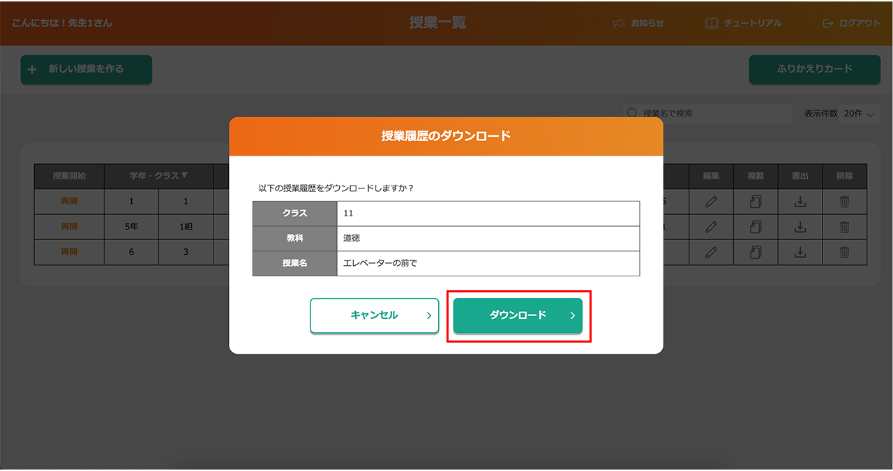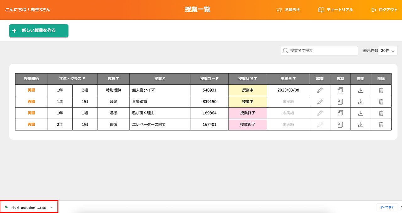 AIAIモンキー 授業終了後 授業履歴の書き出し 2022.08.14 2025.11.27 実施した授業の内容は、Excel形式でダウンロードすることができます。 ①任意の授業の「書出」ボタンをタップ ②選択した内容でよければ、「ダウンロード」ボタンをタップ ③授業履歴がExcel形式でダウンロードされる