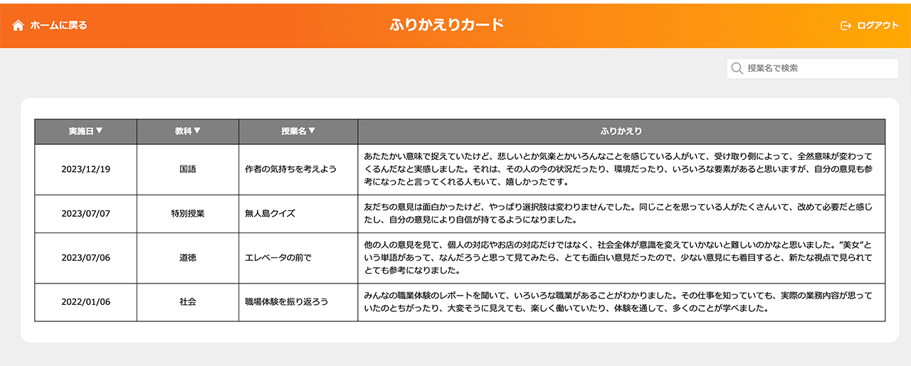 実施した授業の振り返りは、児童生徒ごとに一覧で確認することができます。
