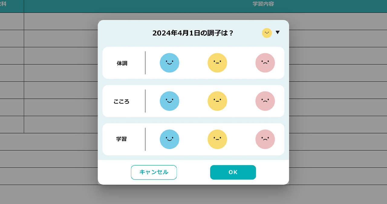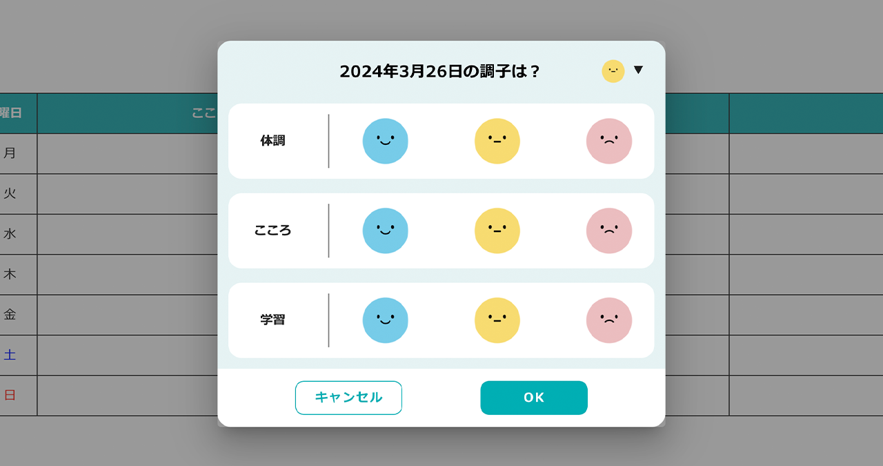 ①ログイン時に表示される「今日の調子」ポップアップで、体調・心・学習の状態に当てはまるスタンプをタップして選択します。