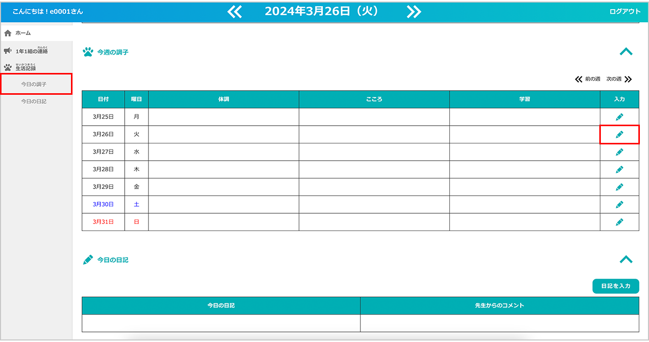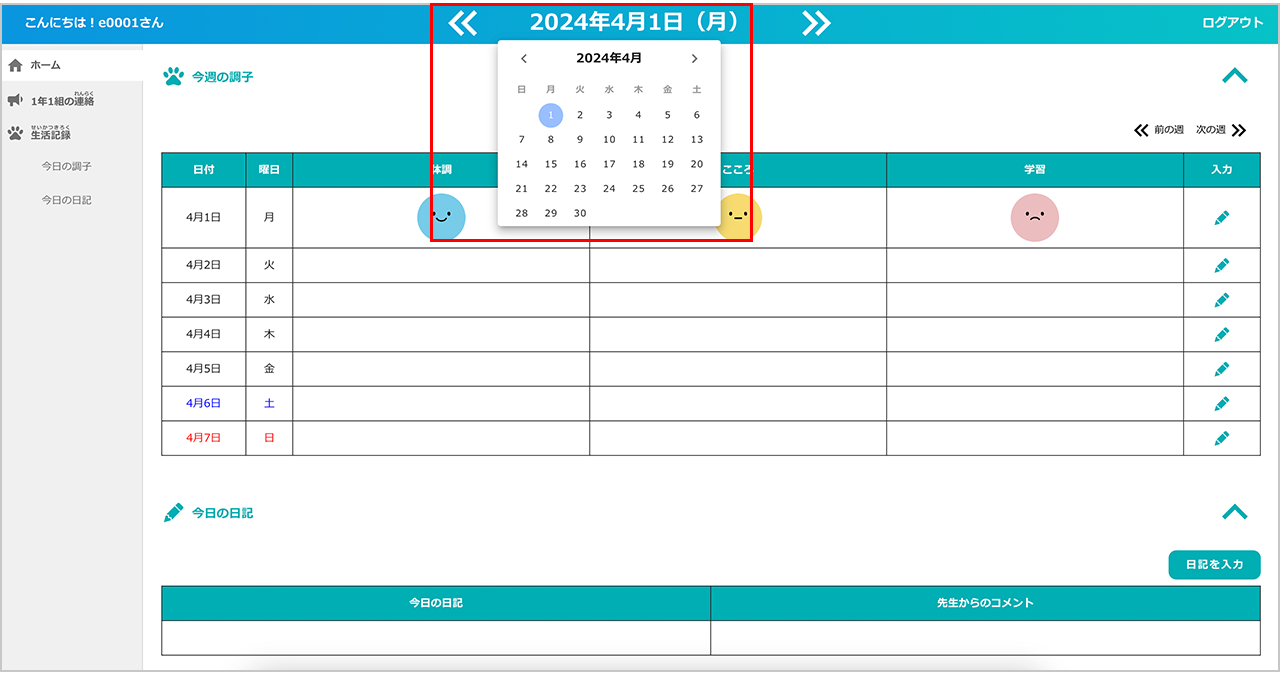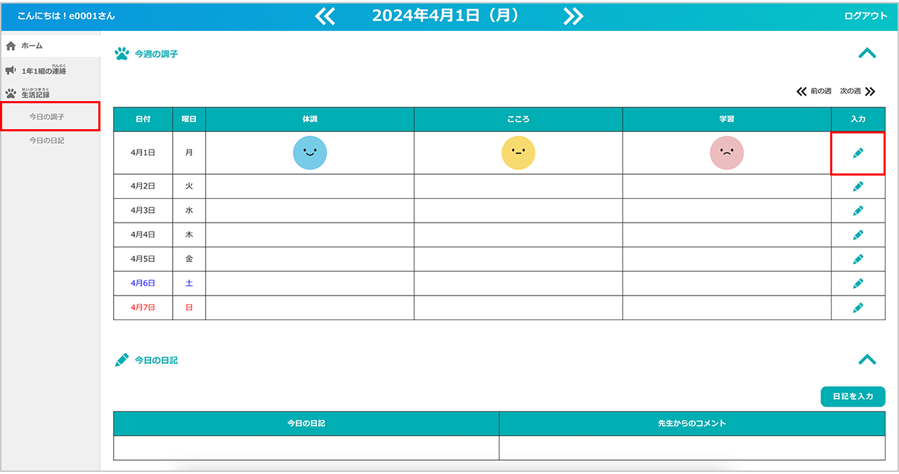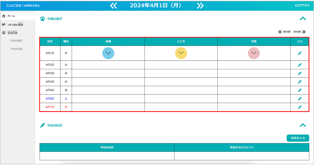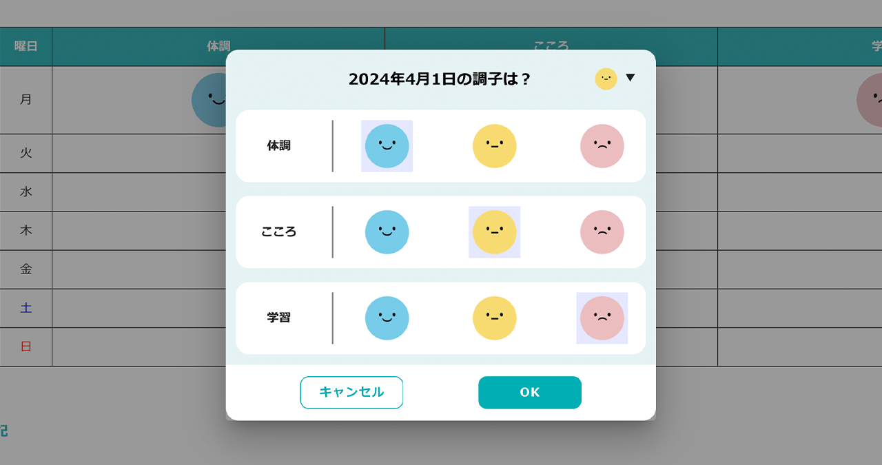 ここでは、体調・心・学習の状態をスタンプで記録し、その日の調子を先生に報告することができます。