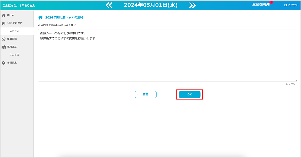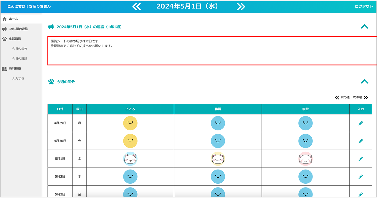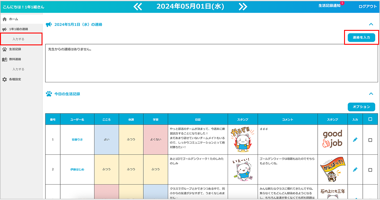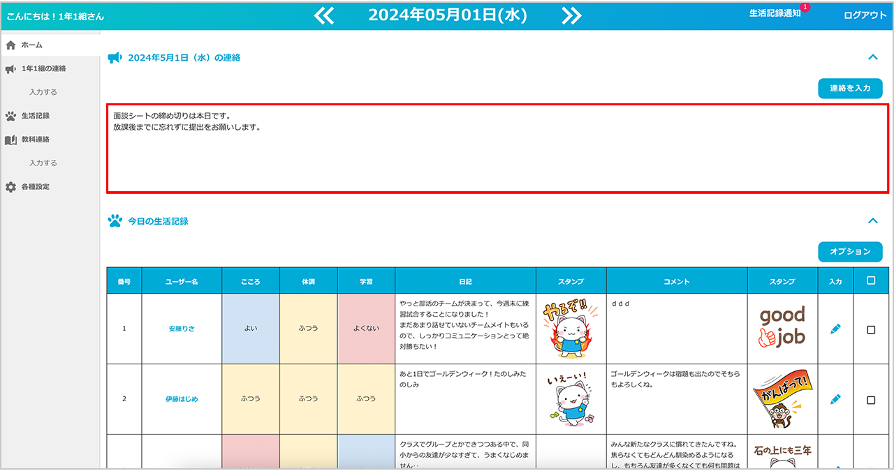 入力した内容は、先生のホーム画面に反映され、対象のクラスの生徒全員に送信されます。