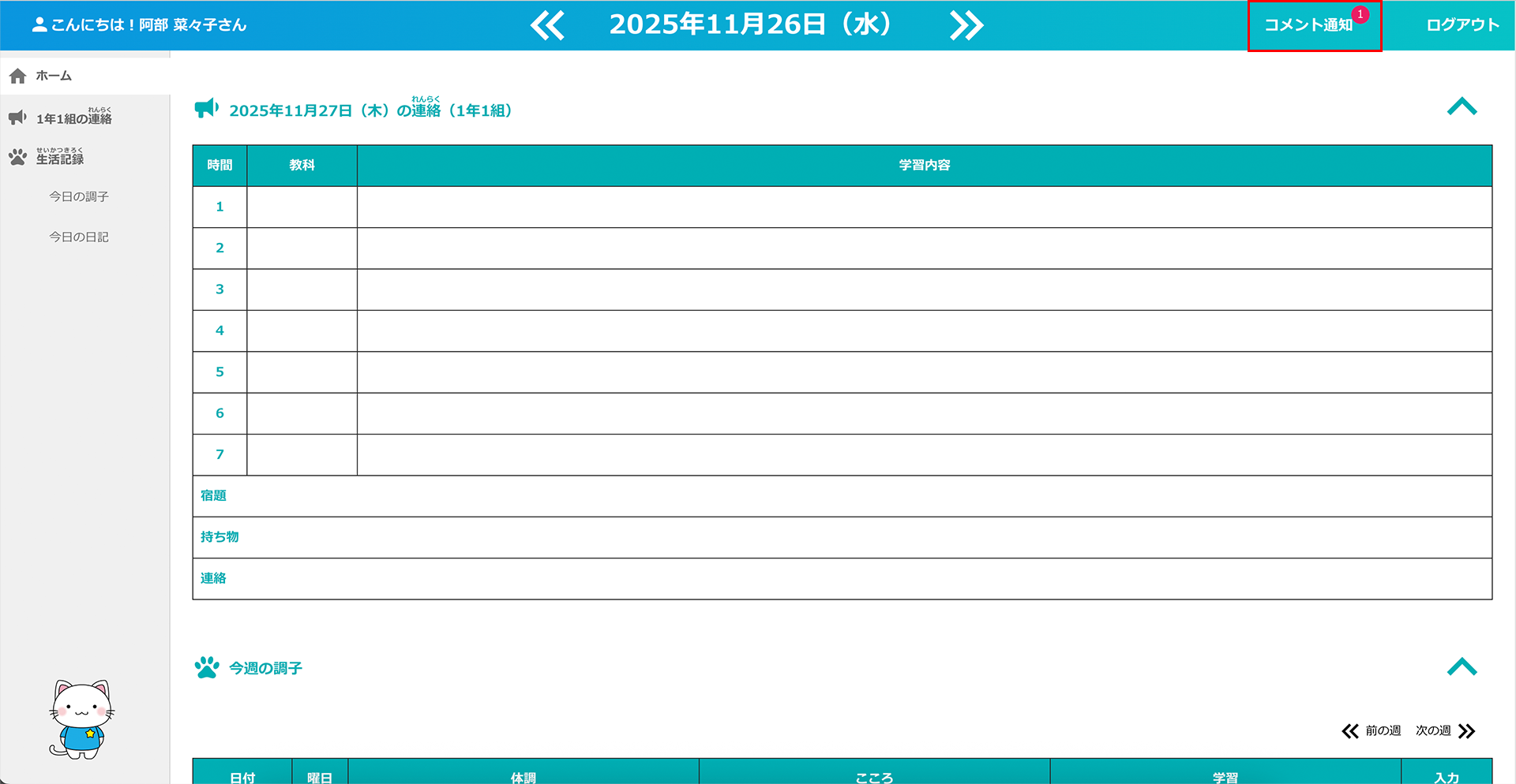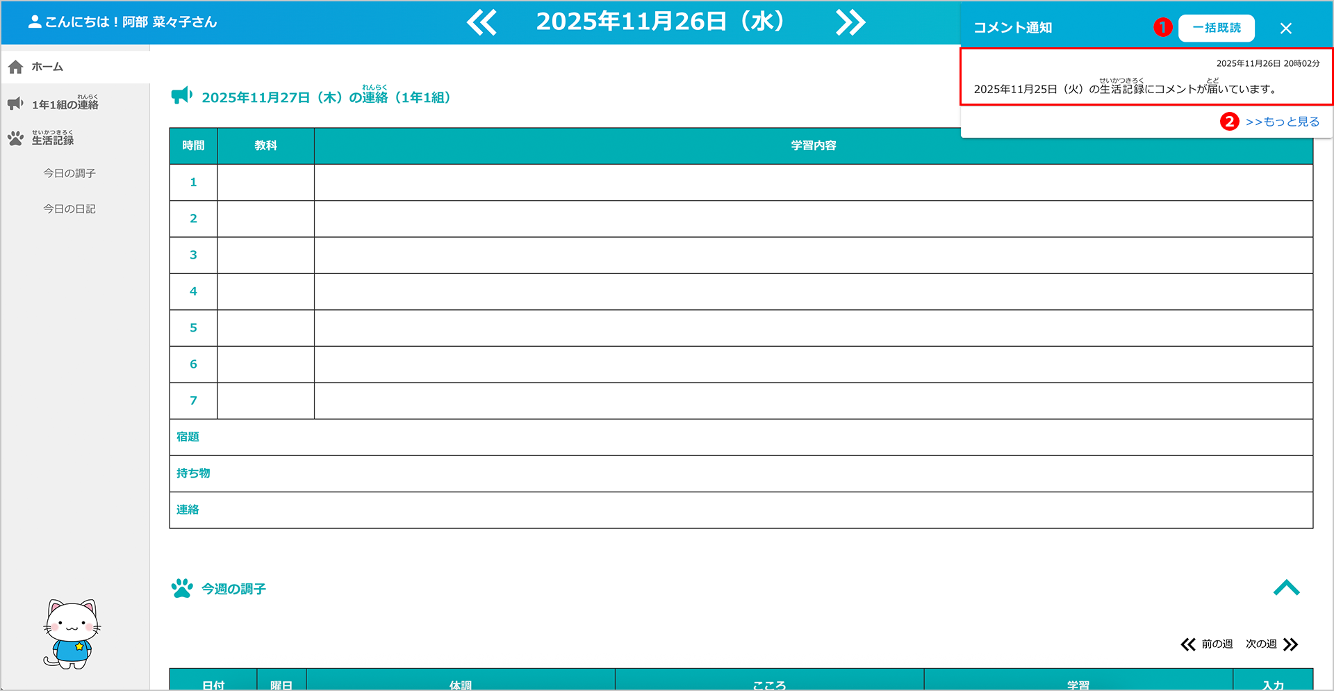 先生が、ログイン当日より過去の日付の生活記録にコメントを入力した場合、見逃し防止のため、児童生徒にコメント通知が届きます。