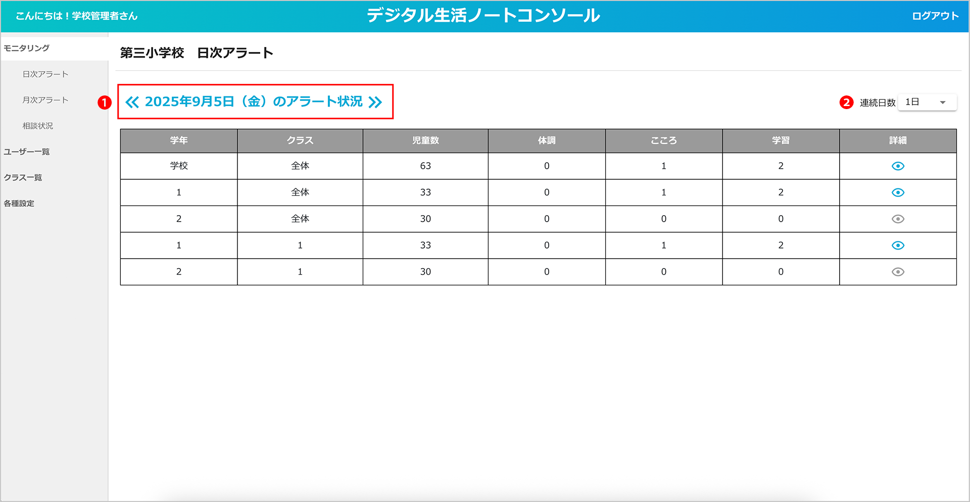 ① 学校管理者でログインすると、最初に「モニタリング」画面が表示されます。