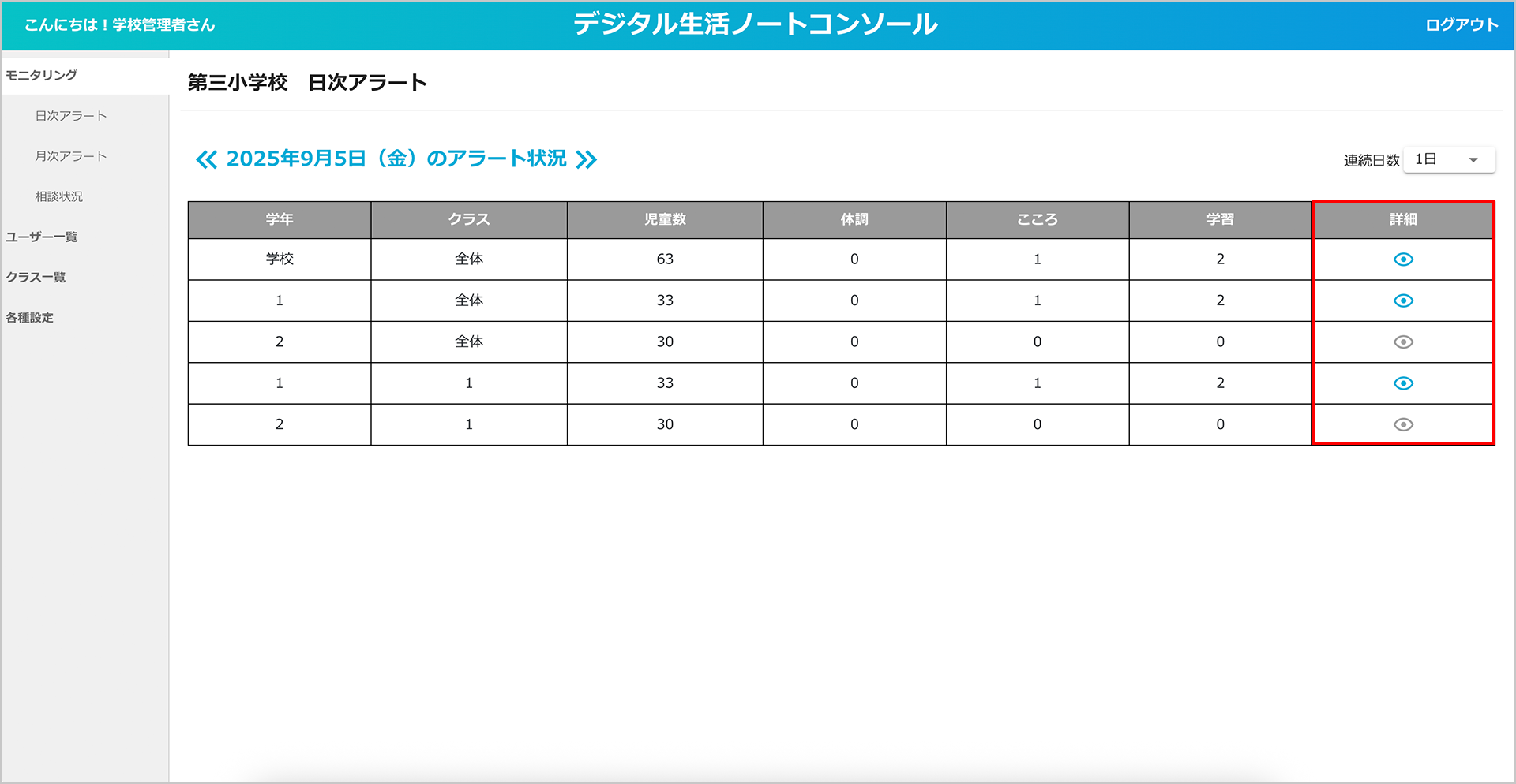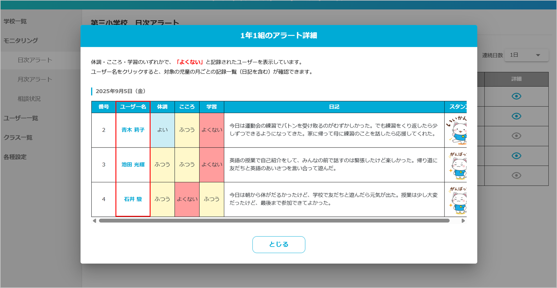 対象クラスでアラートに該当している児童生徒の一覧が表示されます。