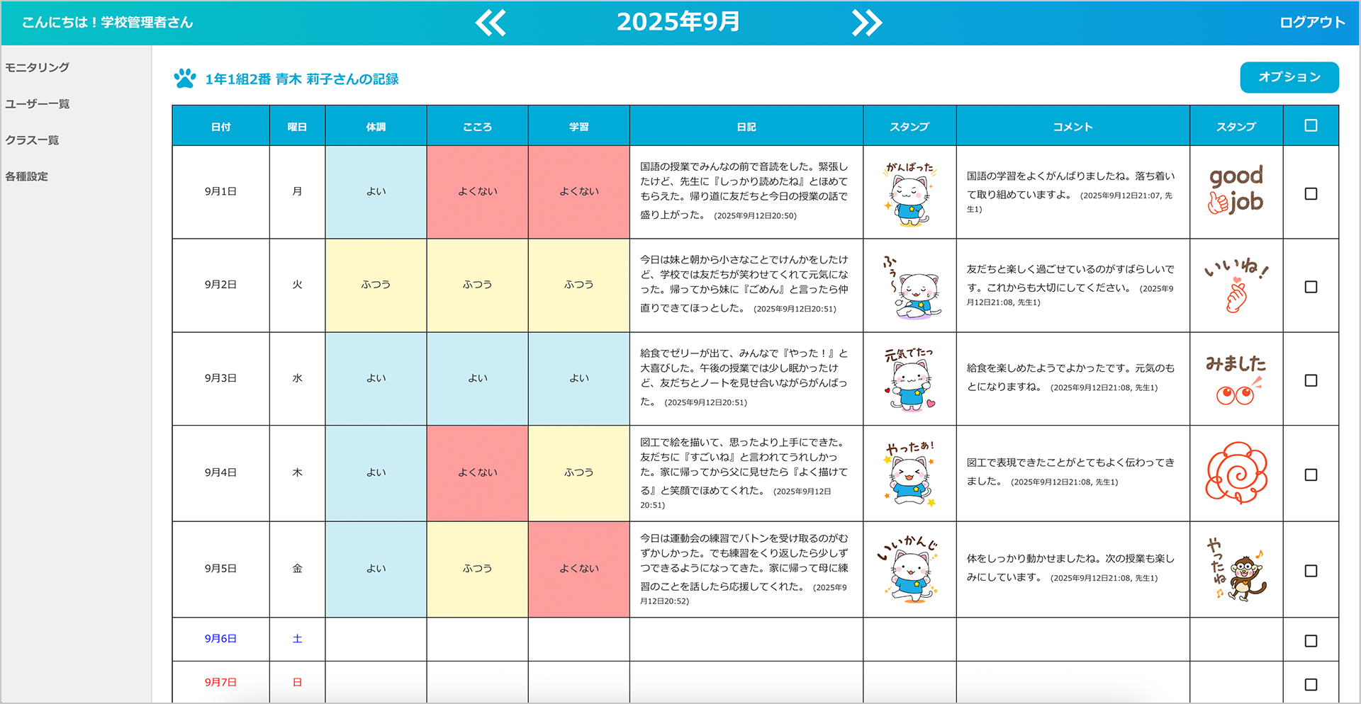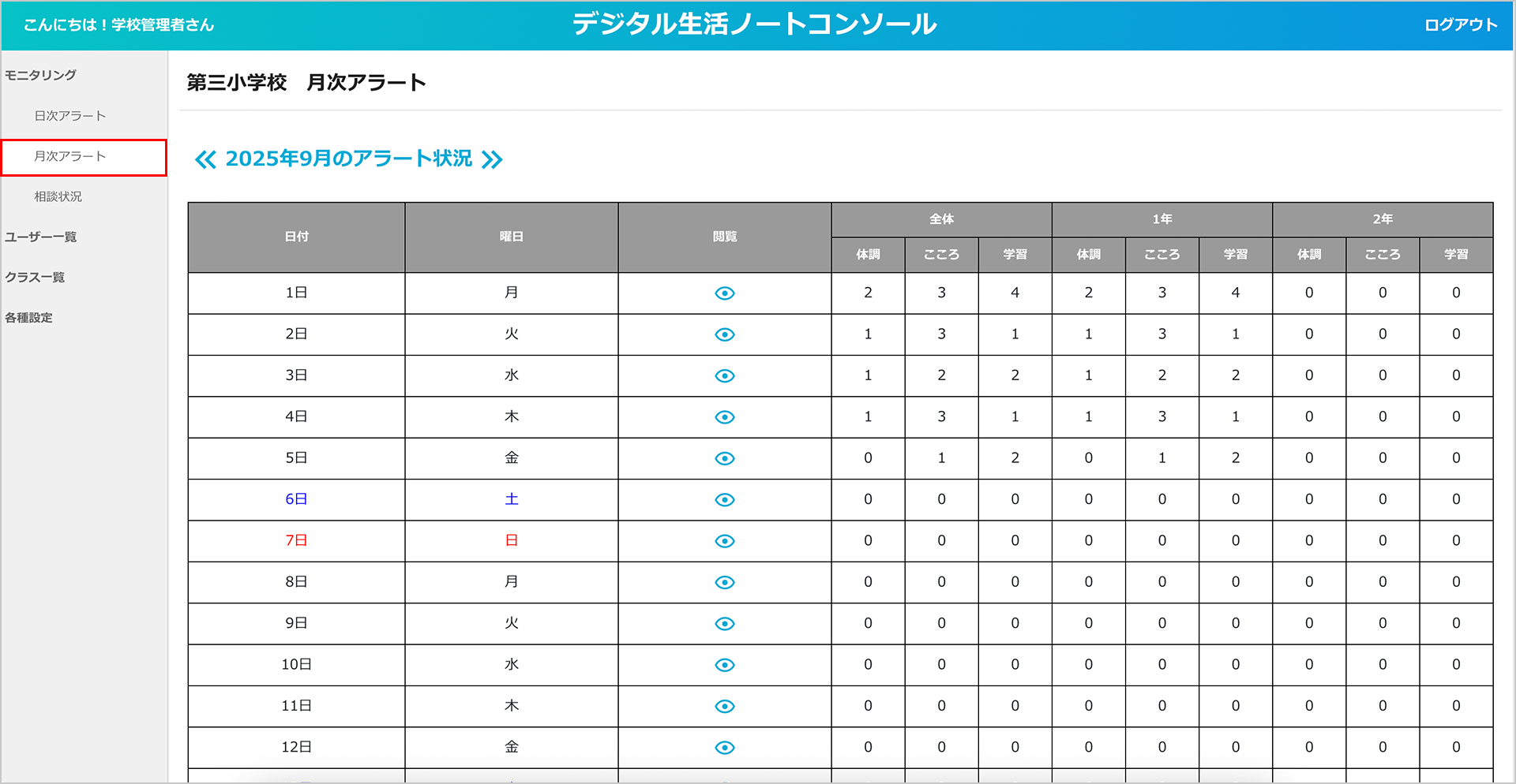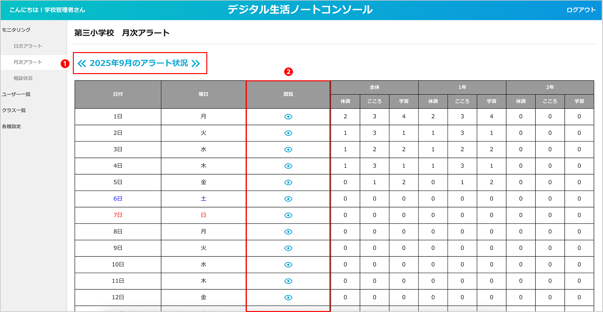 学校管理者は、学年ごと・クラスごとにアラート状況を日次と月次で確認することができます。