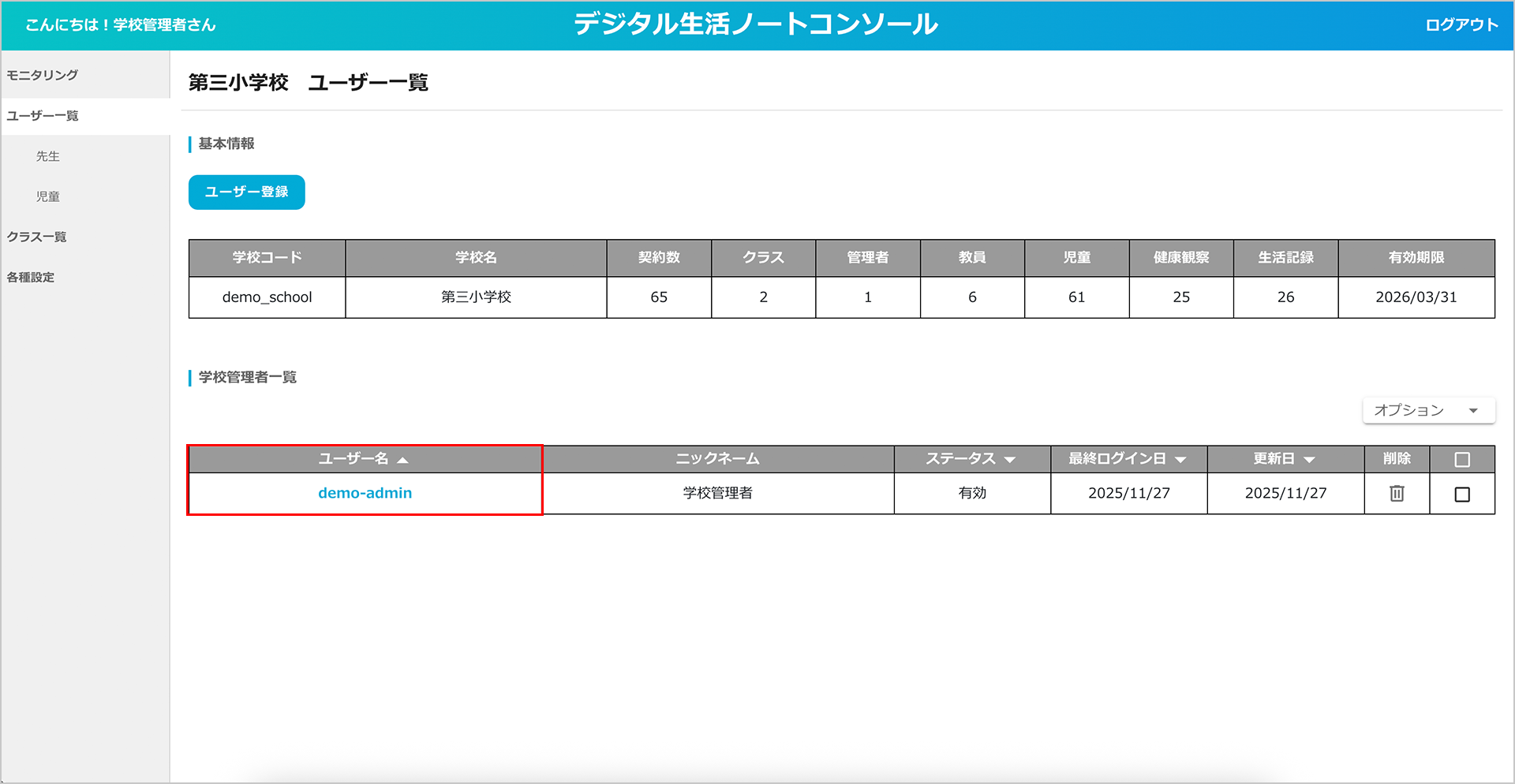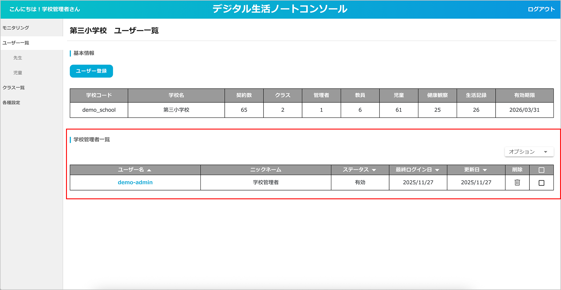 ② 登録されている「学校管理者」一覧を確認することができます。