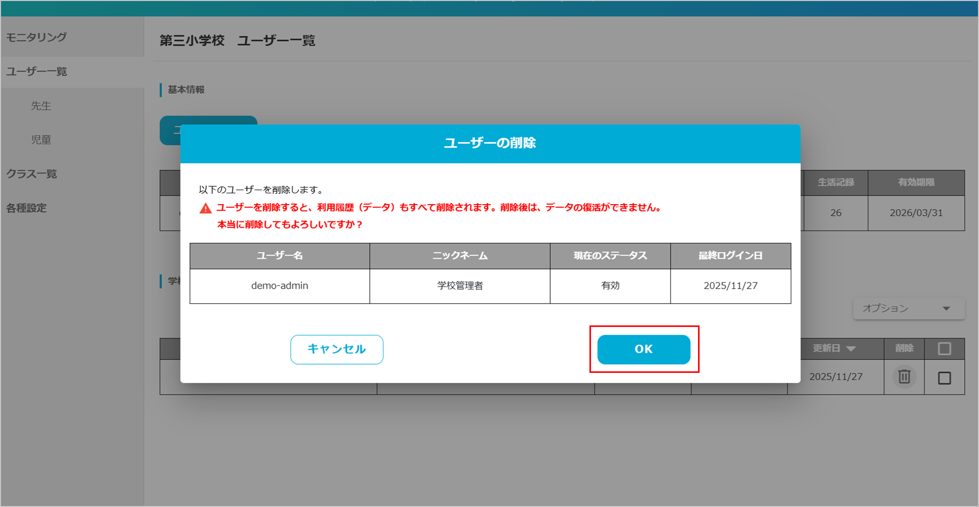 ② 「ユーザーの削除」ポップアップが表示されたら、内容を確認して「OK」ボタンをクリックします。