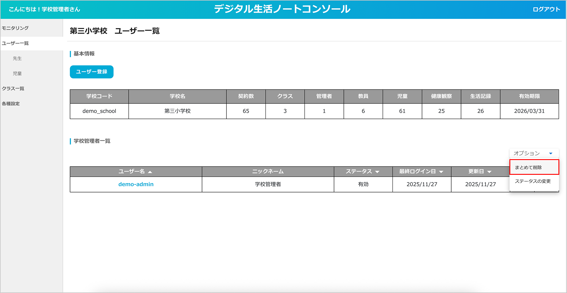 「オプション」ボタンの「まとめて削除」から複数のユーザーをまとめて削除することもできます。