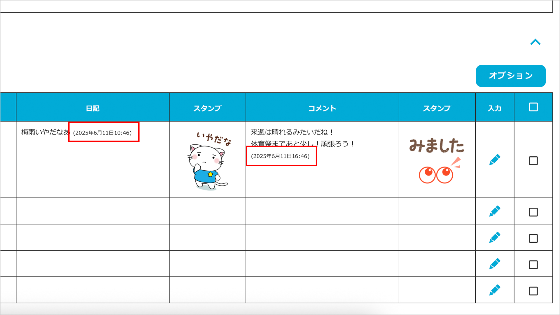 「児童生徒が生活記録を送信した日時」および「先生がコメントを送信した日時」が生活記録一覧画面に表示されるようになりました。なお、児童生徒画面には日時は表示されません。