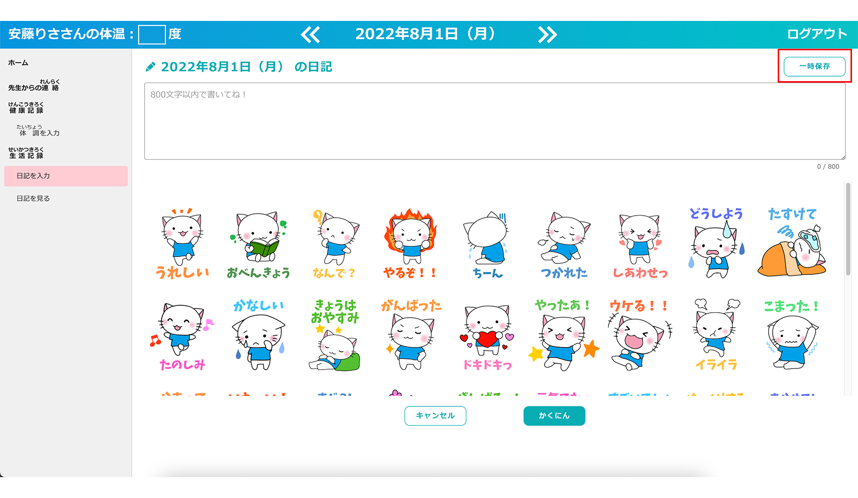 「一時保存」ボタンをクリックすると、入力した内容が自分のタブレットのみに保存されます。
