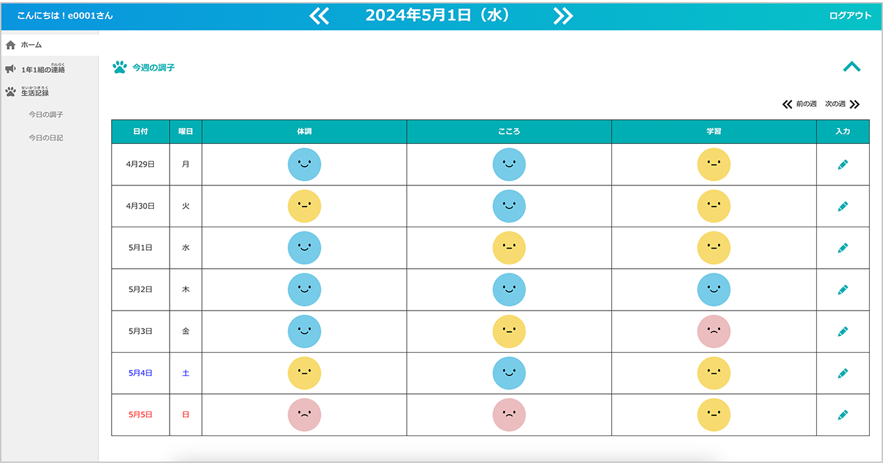 先生は、児童生徒の状態記録をクラス毎・児童生徒毎に一覧で確認することができます。