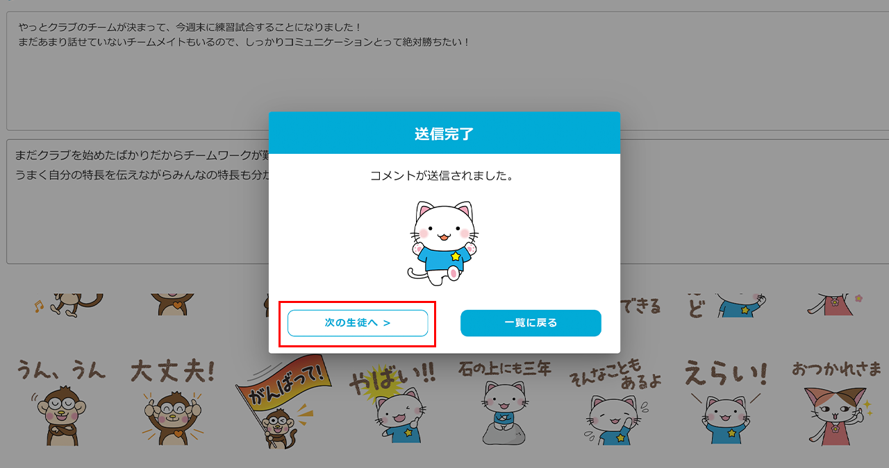 個別コメントを送信後は、次の児童生徒の返信ページを直接開くことができます。