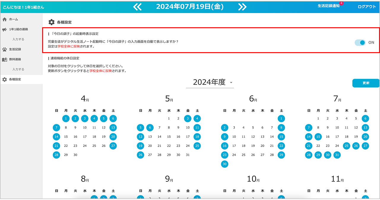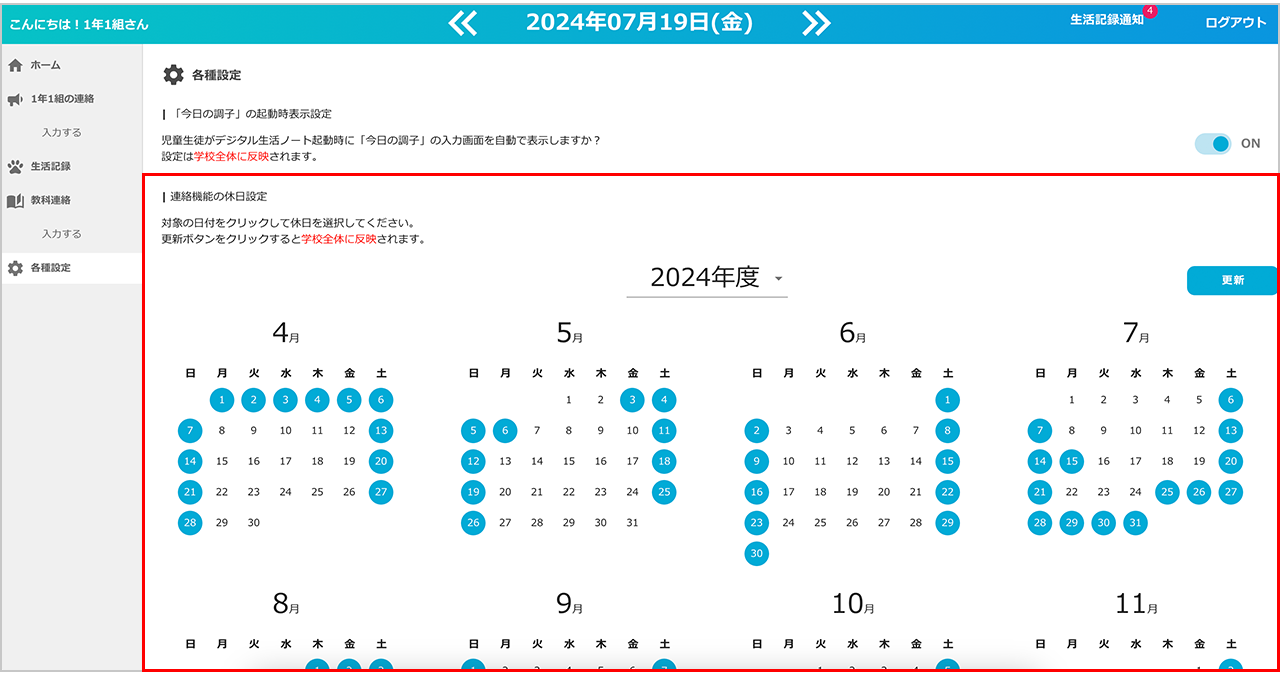 ▶️「先生からの連絡(小学校)」「教科連絡(中学校)」の休日を設定することができます。