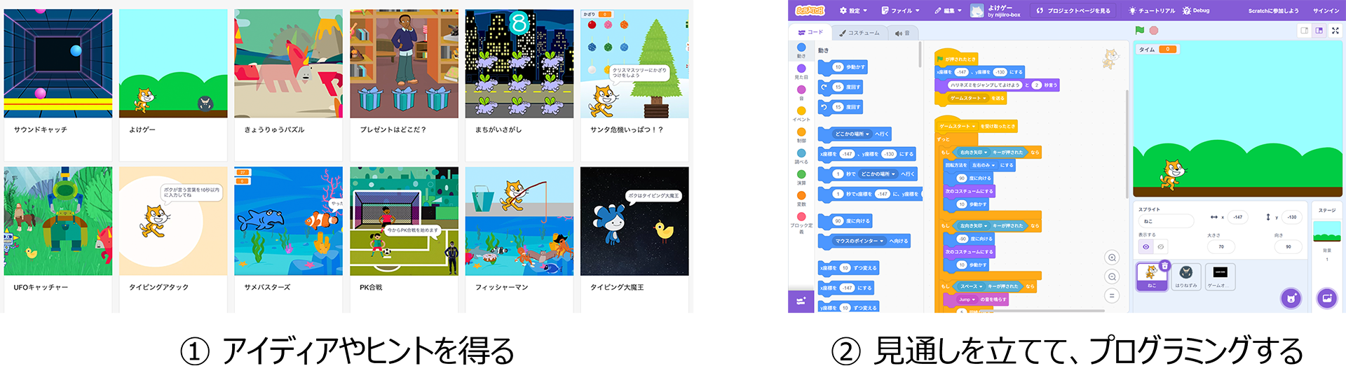 虹色ボックスでは、Scratchの操作方法や各ブロックの使い方、さまざまなプログラムの作り方を段階的に学ぶことができます。